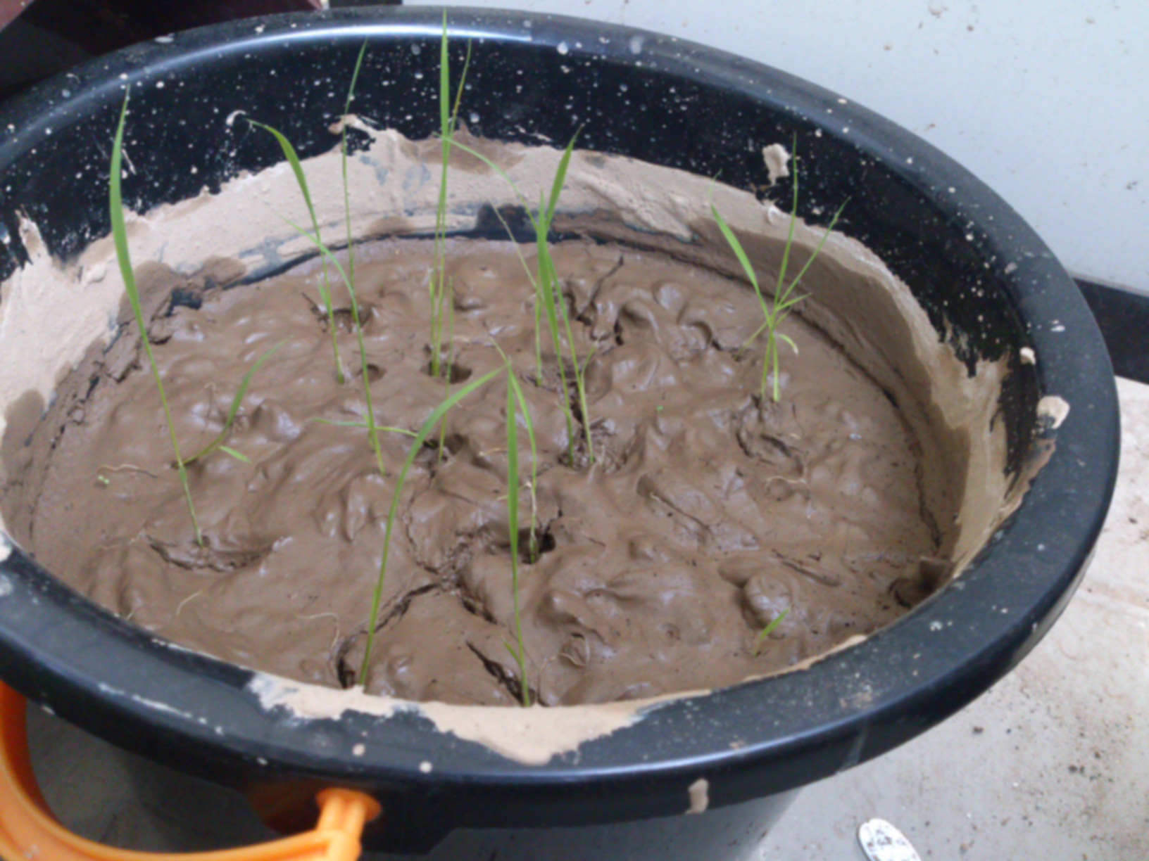 芽の出てきた種モミを植えて数日、葉がのびてきました~~。